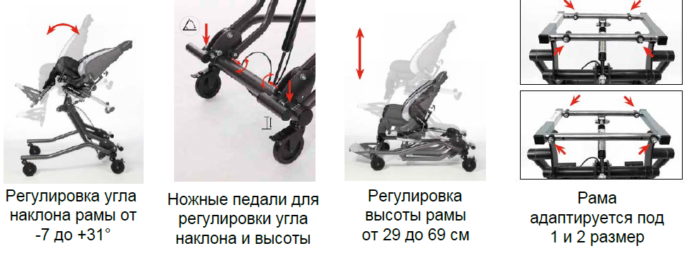 Растет вместе с пользователем засчет множества регулировок (регулировка ширины, сиденья, глубины сиденья, высоты спинки, высоты подножки). Регулировка угла наклона и высоты подножки, возможность складывания и использования с ремешком для фиксации ног. Центральный рычаг позволяет изменять угол наклона сиденья или отсоединить сиденье от шасси одной рукой.